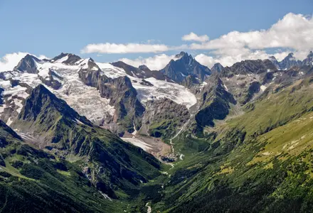 Край синего неба, пьянящего воздуха, стремительных рек, всех поражает белизна огромных ледников, изумрудная зелень лесов и яркое разнотравие альпийских лугов.