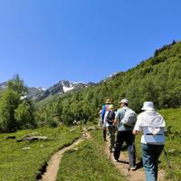 Далее тропа приведет нас на огромную поляну, на которой в июле всегда цветут всеми красками альпийские луга. Отсюда впервые увидим огромный, белоснежный ледник Алибек. Он спускается очень низко в долину, поэтому его можно очень хорошо рассмотреть.