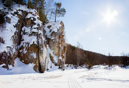 Камень Башня – название возникло из-за того, что по форме камень напоминает высокую башню старинной крепости с высоты которого открывается красивый вид на окрестную тайгу и изгибы реки.