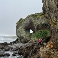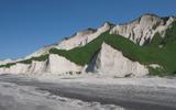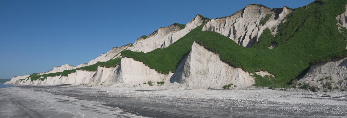 Пейзаж уникален благодаря сочетанию белоснежных скал, темного, почти черного песка, покрытого белым кварцем и черным титаномагнетитом, а также бурного Охотского моря.